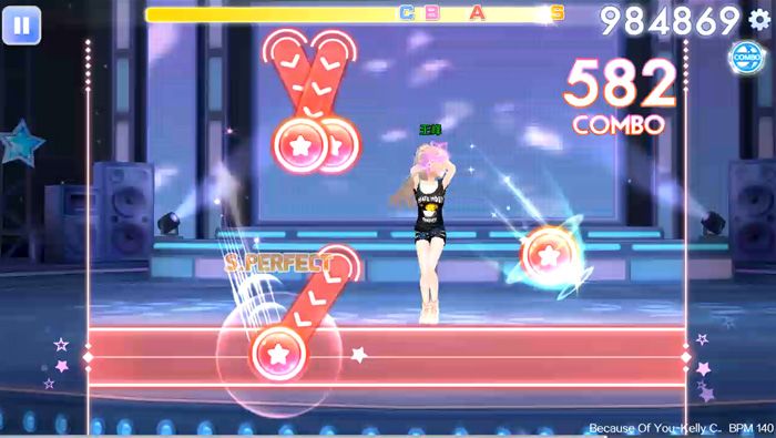 Because Of You歌曲的BPM速度达到了140,如果只是想完成S评价条件通关,可以选择得分提高,这个技能可以稳定提高每个音符的得分。如果想要挑战章节最高得分,推荐使用连击加成,这个技能适合可以打出COMBO连击的玩家使用,下面就给玩家介绍这首歌的音符难点,帮助大家快速达成S评价通关。