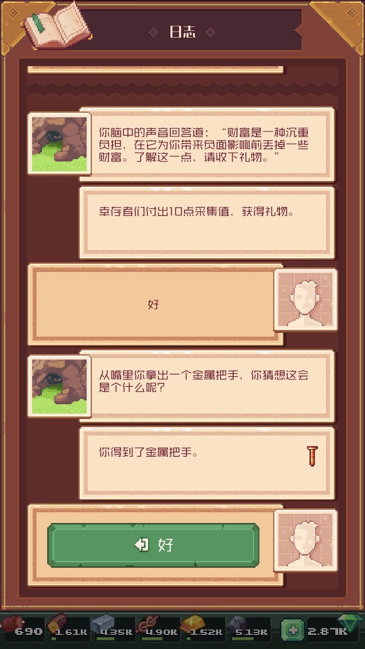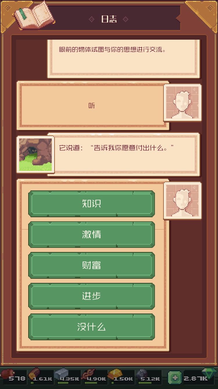 我选的财富,不过我猜这四个选项应该是这样的:财富代表采集,知识代表探索,激情代表战斗, 进步代表建筑。至于各位怎么选就仁者见仁智者见智了。至于他给我的东西还没用到