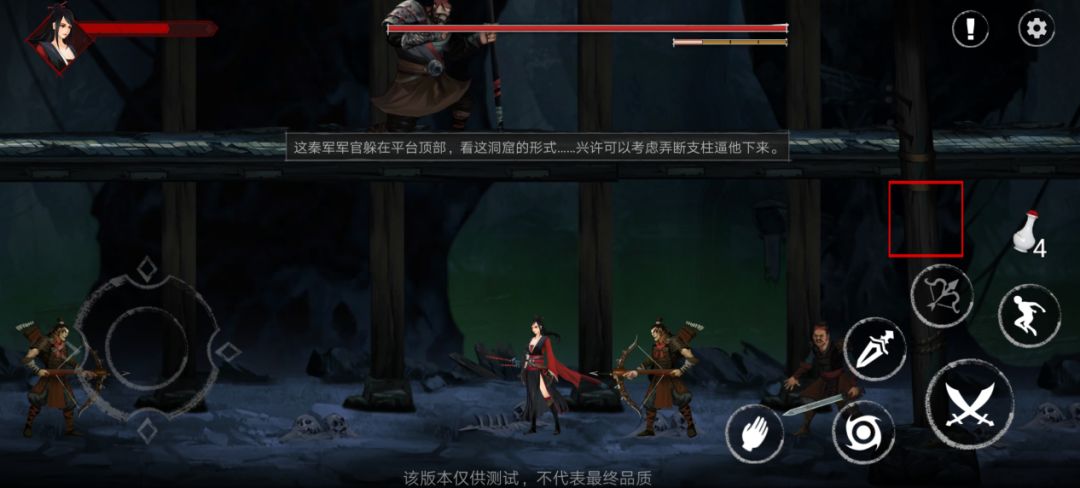 击碎两侧的木桩后,需要玩家长按互动键摧毁位于平台下方的支撑木,在摧毁的途中,秦军百夫长会紧跟人物的脚步,并投下巨石;被击中后,人物会立刻陷入濒死状态,游戏重来,各位侠士需要根据其攻击动作进行规避。当摧毁完支撑木后,各位侠士将会直面秦军百夫长。