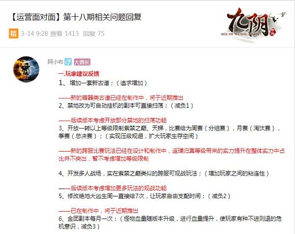 在减负的同时,游戏运营团队将玩家的意见和反馈视若珍宝,并每周持续在论坛展开“运营面对面”活动,现已进行了共十八期。在活动中,游戏运营会详细回复和解答玩家对游戏的问题和想法,并根据玩家的意愿及时调整游戏玩法。在本次更新中,游戏增加全新武学,修改了绝地求生玩法次数,增加了天梯奖励、增加活力机制并优化了交易行友好度等内容都是根据玩家们的建议做出的改动。运营团队也透露,游戏中的每一个侠客都是《九阴》手游的主人,他们会继续开展“运营面对面”活动,争取为玩家奉上最纯正的武侠江湖!
