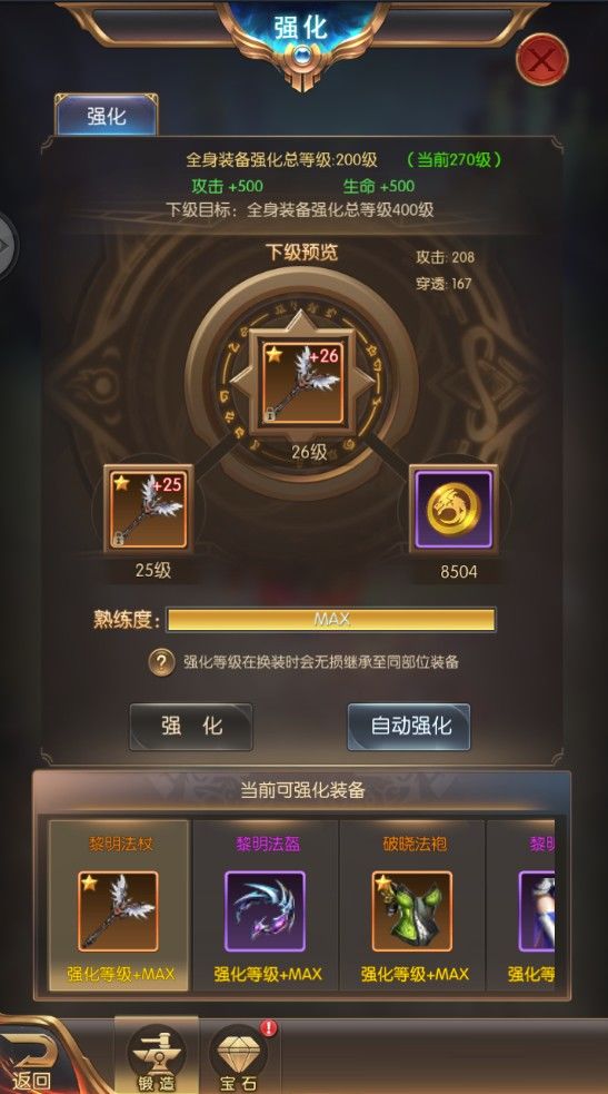 1. 直接强化、进入各装备的页面均有一键提升功能自动消耗所需耗材强化装备