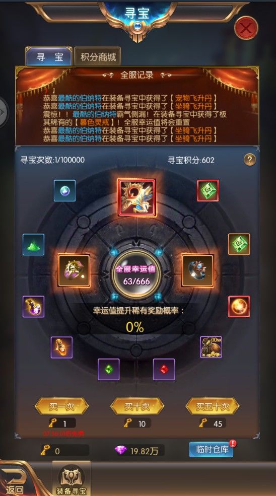 【寻宝】玩家通过寻宝可以获得高阶装备与神兵大礼!每隔8小时更有一次免费寻宝的机会~每次抽取宝物增加全服的幸运度,幸运值将提升稀有奖励概率。