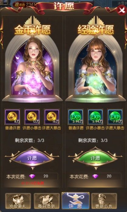 【许愿】 许愿是一个快速获得金币和经验的途径,通过许愿可以将钻石转化为大量金币和经验,系统每天还送每位玩家一定次数的免费许愿机会~玩家每天可以使用的许愿次数是固定的,VIP等级越高,每天可以使用的许愿次数越多喔。