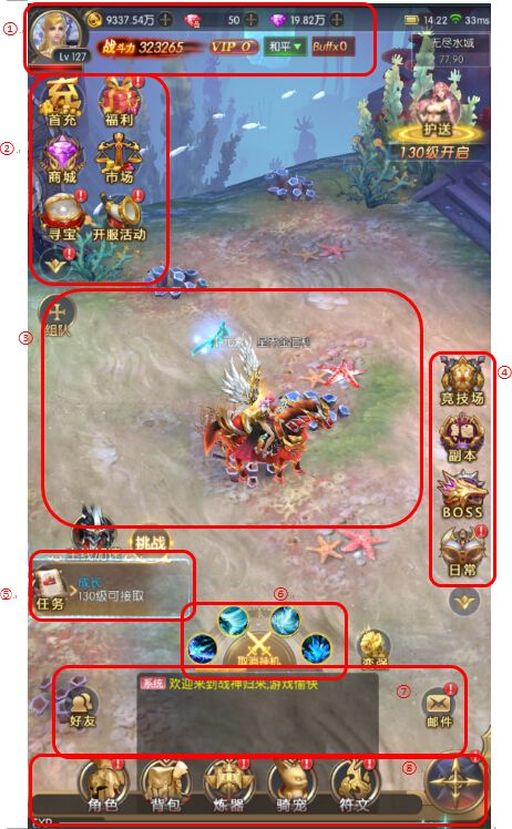 ①:玩家信息区,包括玩家等级、血量、战力、金钱、钻石数据等;