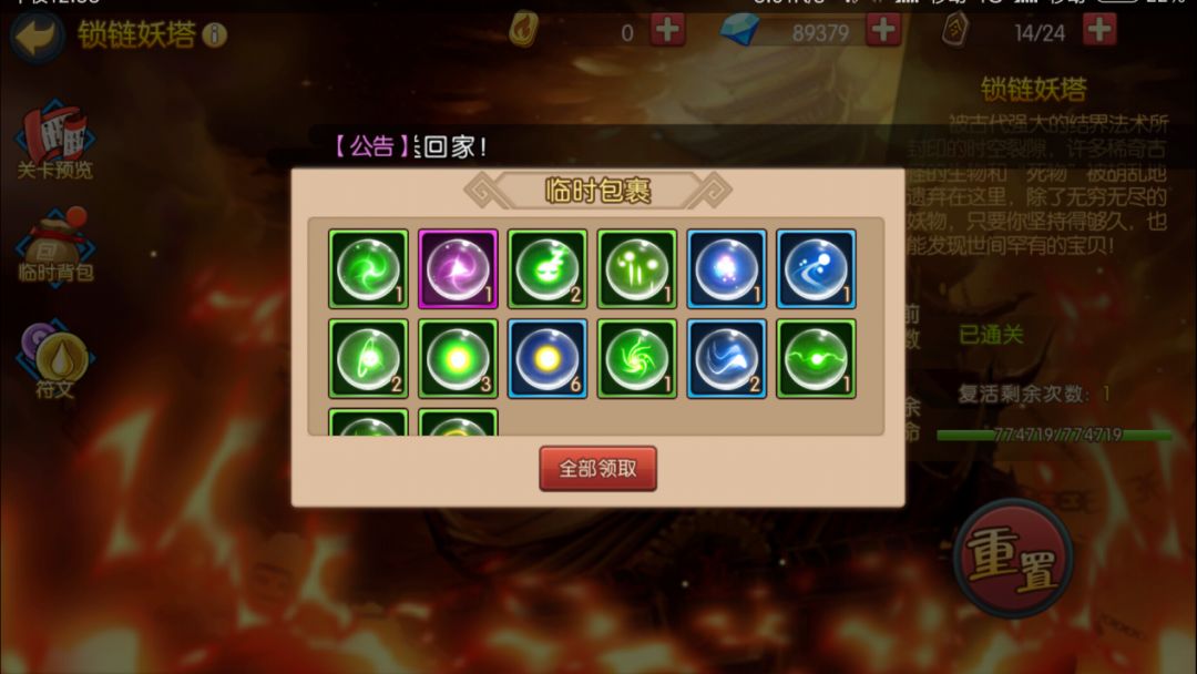 锁链妖塔,是简要概括来说,就是一个爬塔闯关的玩法,共九层,每一层通关都会随机获得对应关卡的掉落物品奖励。越高的层次难度越大,对战力、操作的要求更高。