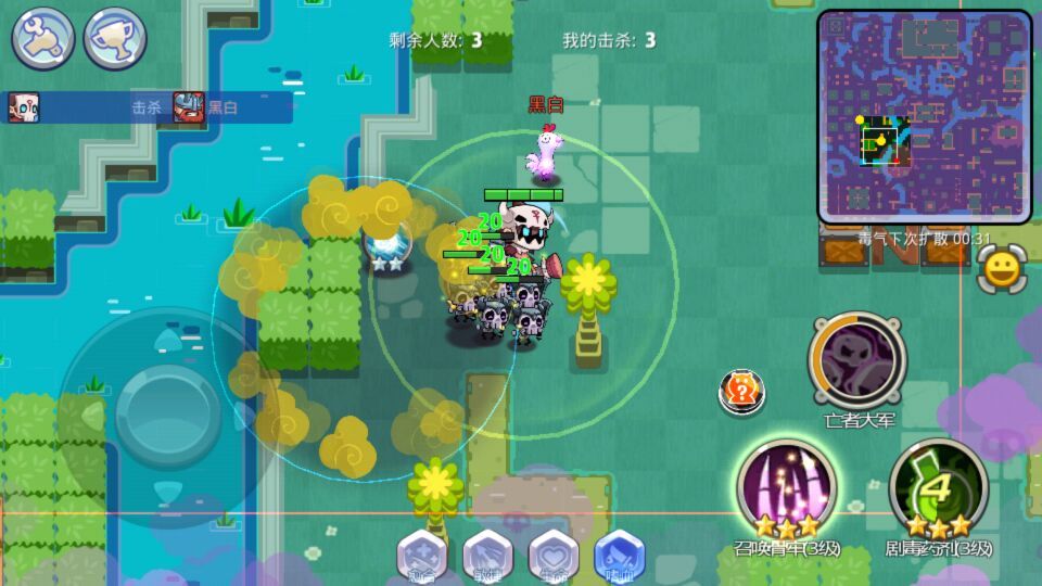 这个技能我是一般不会用的,优点可以召唤一个小骷髅来帮助你作战,帮你抗伤害打火娃娃,雪人,全能这些英雄比较好。缺点近身能力太弱,几乎打不到,遇到忍者没啥活路,可以选择烈火环来帮助他近身能力,2-3⭐可以选择,1⭐范围太小。(死亡气息打到小鸡身上也是会召唤骷髅,可以喷小鸡来积攒小骷髅,然后如果有亡灵大军这个大招,也可以使用这个技能)