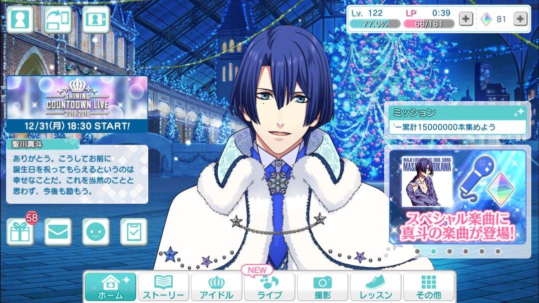 为了和季节映衬尽量都是选17圣诞那套衣服,除了トキヤ,四宮,寿嶺二,实在没有卡所以拿了sweet cafe这套,我才不会告诉你圣诞节这套已经是集得最齐的一套了…当然莲是特别的,其实是我忘记给他换了…官方爸爸总是一如既往的友好,登陆即送50水晶