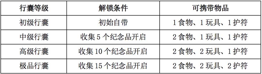 行囊是影响宠物旅行地点和带回物品的关键因素,可携带食物、玩具、护符三类道具,每类道具最多可同时携带2个,且允许同一道具重复携带(效果可叠加)。行囊分为初级、中级、高级和极品四种,解锁条件和功能详见下表: