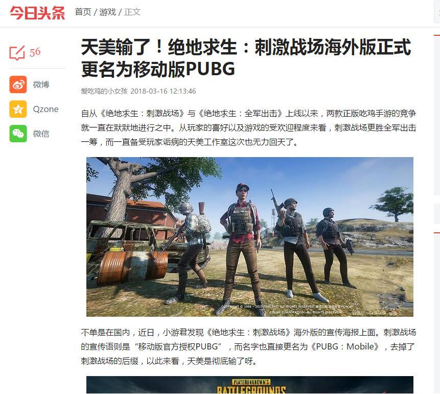 作为逛各大论坛比游戏时间的我无意中发现了刺激战场居然出来了国际服 ,我第一时间是自豪,能让老外玩中国吃鸡手游想想都很6啊,,,虽说各有各的优点,但这回天美是真的输了,不论在国内的口碑,还是国际服的推广都输了,刺激战场已经在赢了全军一筹,后续就是光子努力优化游戏,越做越好了,最后请全军的忠实玩家轻喷,我只是说出了现在的情形和我的观点=-=