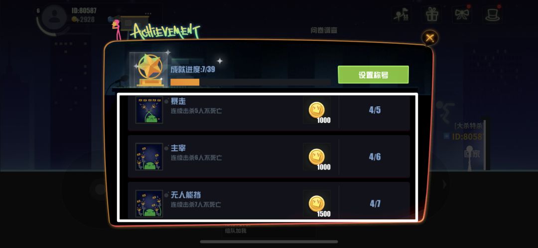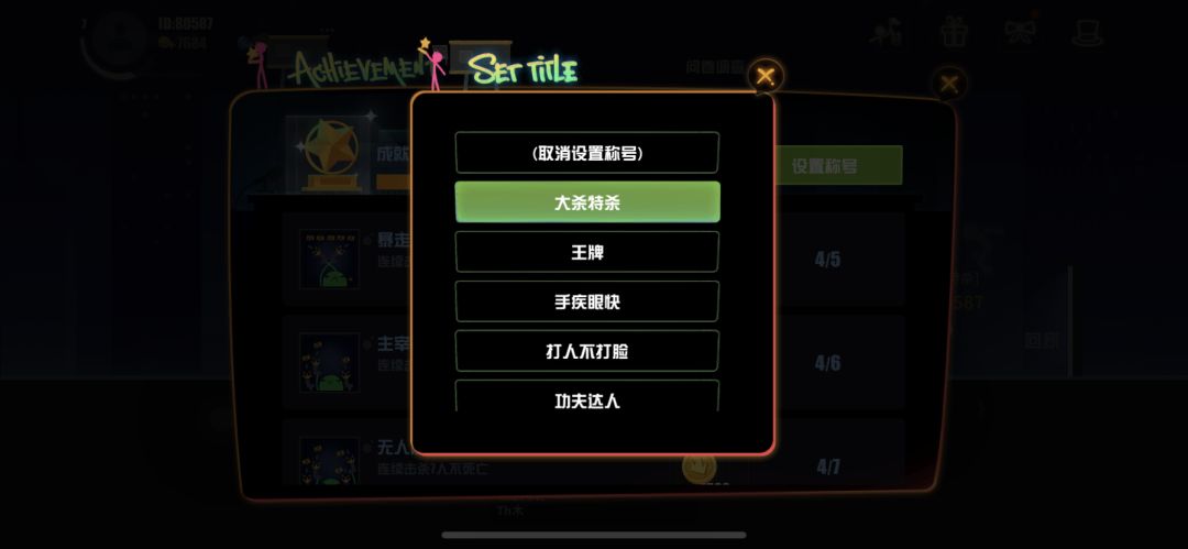 成就系统会根据火柴人在游戏过程中触发到的某些条件解锁相应成就,发放丰厚的金币奖励、钻石和服装等奖励。火柴人每解锁一项特定成就即可获得相应的专属称号。点击成就页面右上角的[设置称号]栏,即可带着响亮的名号在火柴人的战场里闯荡了~