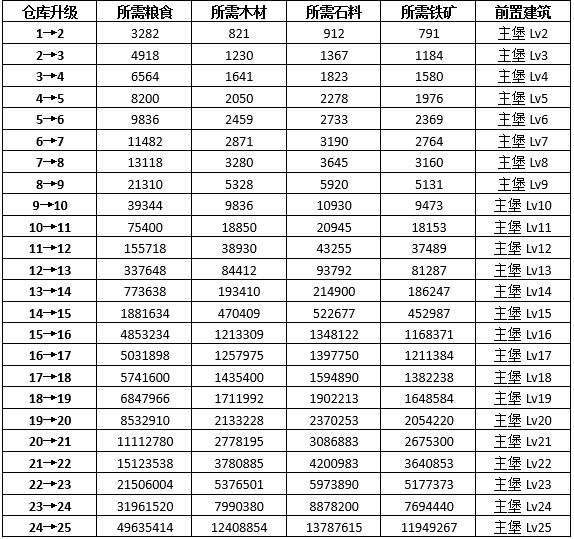 仓库的每一级升级都需消耗一定的粮食、木材、石料与铁矿资源,并要求其前置建筑主堡等级在其之上。领主们通过资源田采集、野外掠夺等方式即可获得仓库升级所需的资源。