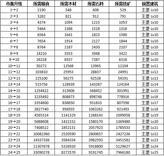 市集建筑升级需消耗粮食、木材、石料、铁矿等资源,并有一定的前置建筑等级需求。建筑升级后会提升单次资源运输量、单次资源交易量,与降低资源运输税率。满级的市集还有运输行军速度提升100%的效果。