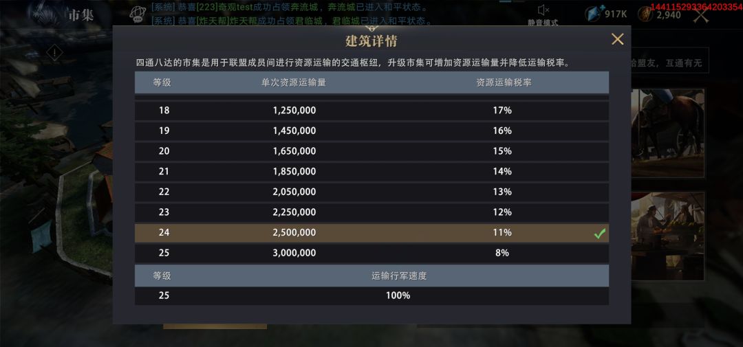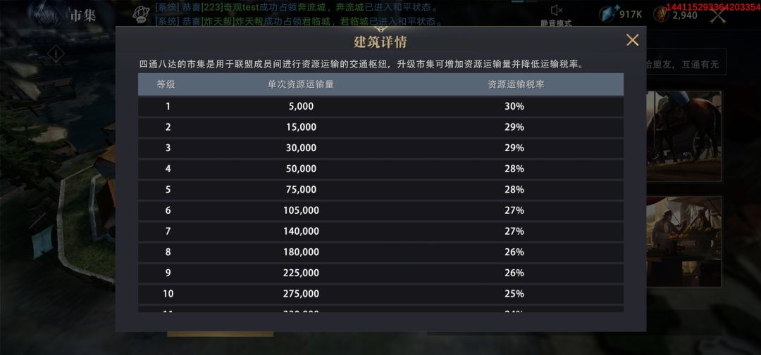 显然在市集建筑的等级提升后,单次资源运输量与单次资源交易量都有了较大提升,且运输税率在同步降低。如此在越高等级的市集下,我们相对能在更少的税率损耗下运输/交易更多的资源。