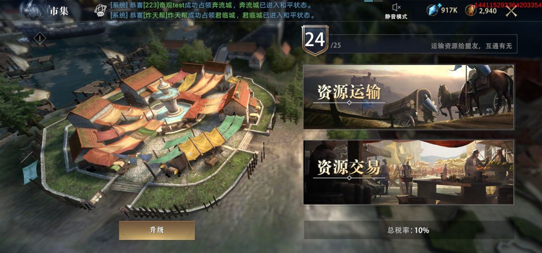 通过野外采集、野外掠夺、建造资源田、完成游戏内任务活动等都可获得大量市集升级所需的粮食等各类资源,帮助市集升级。市集升级后还会带来税率减少的效果,使我们以更少的资源成本代价换取/运输需要的医院。