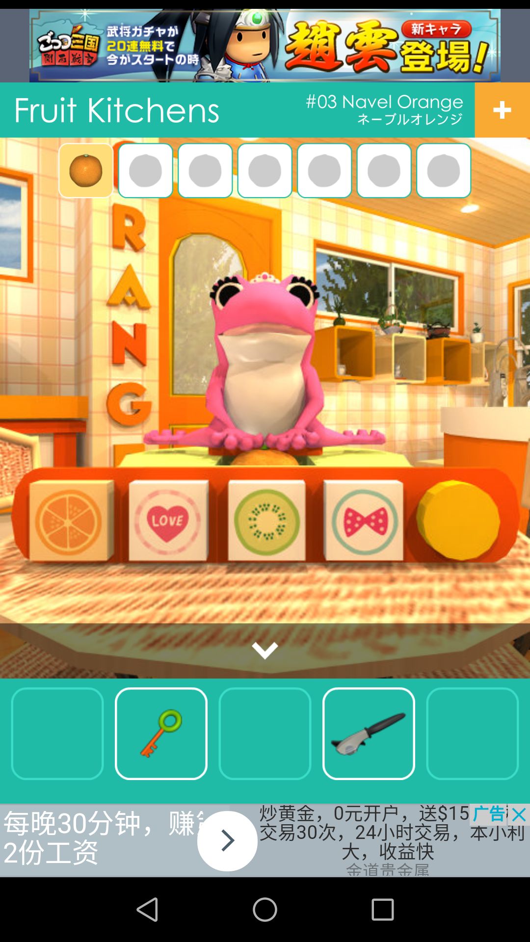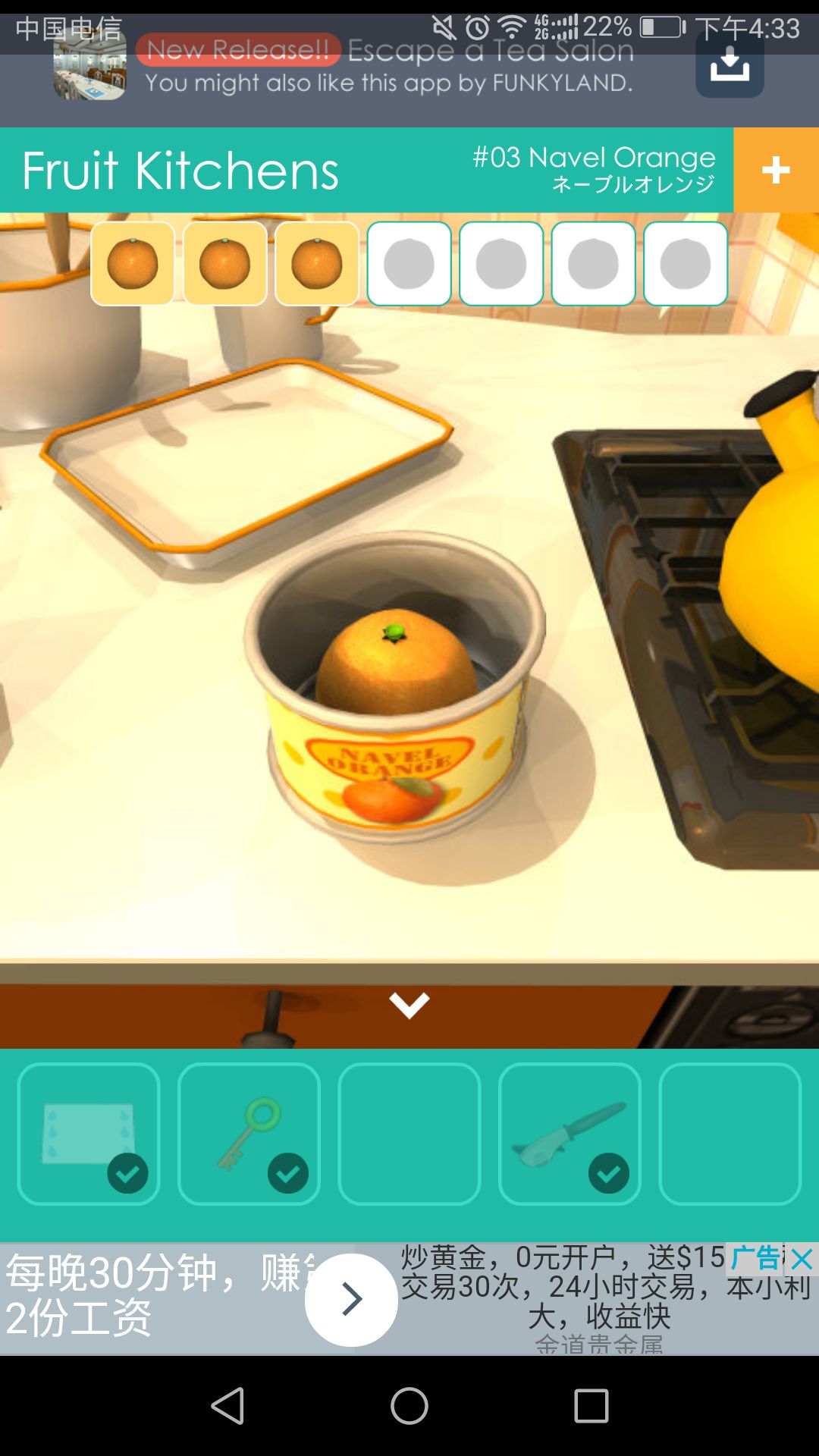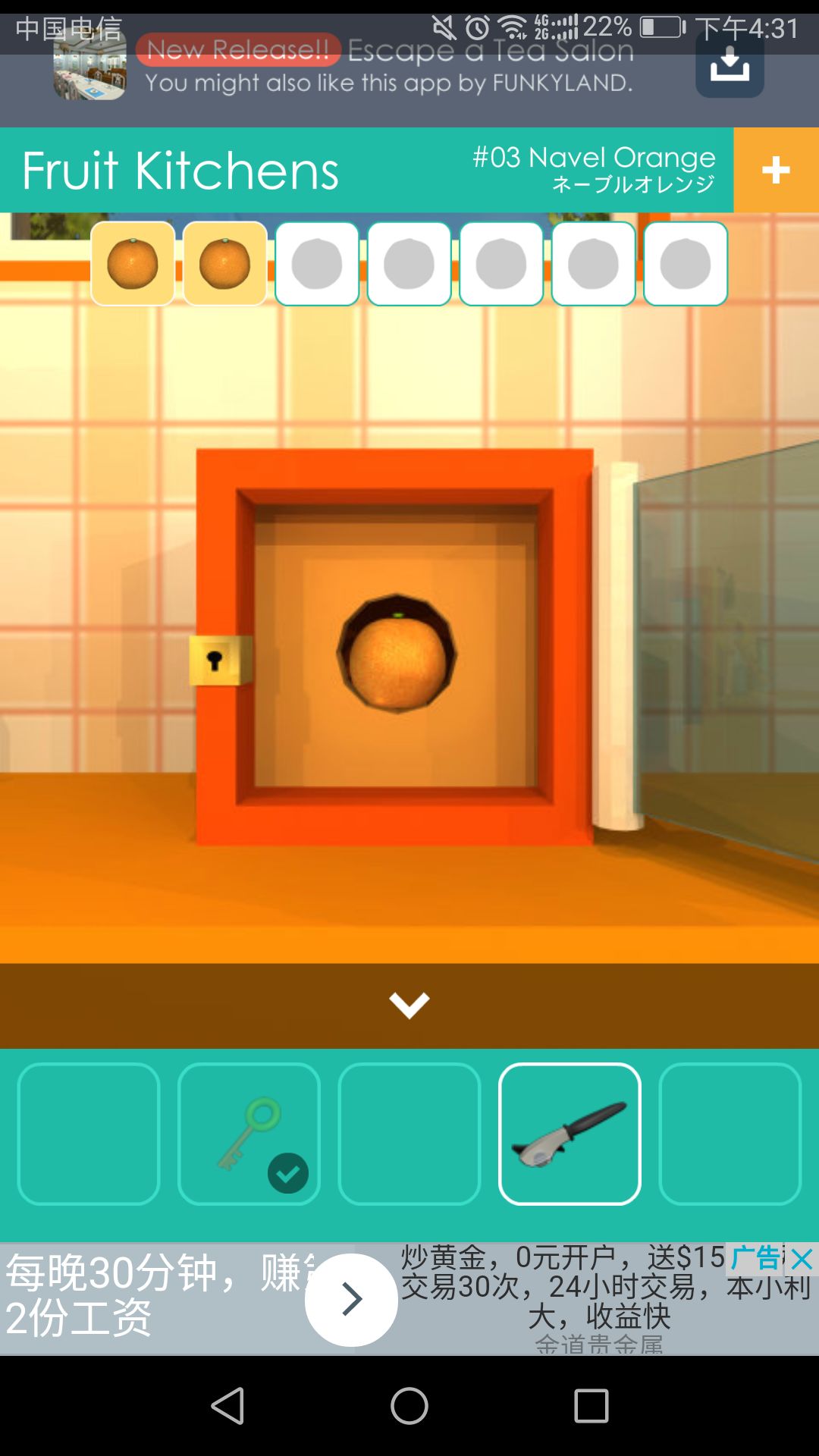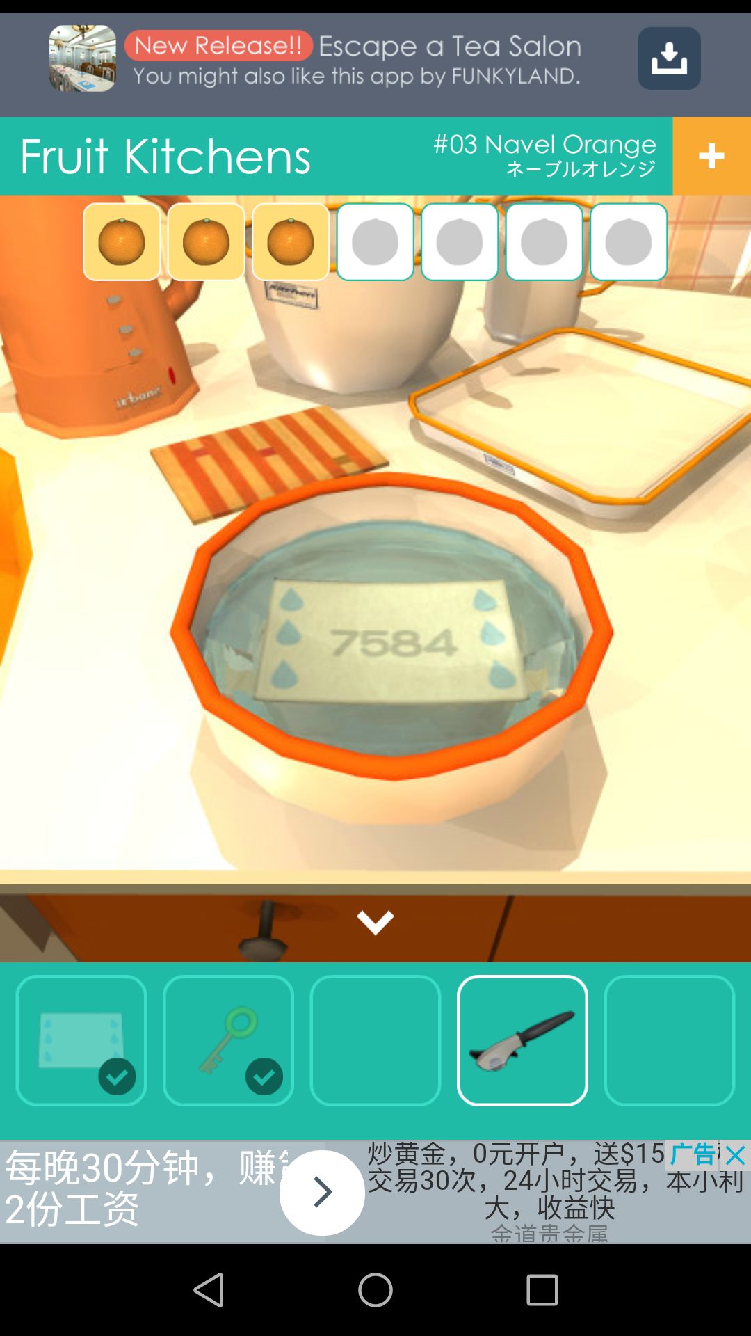 去到厨房,点击桌子,得到钥匙,窗户上的扳手,柜子上的第一个🍊。