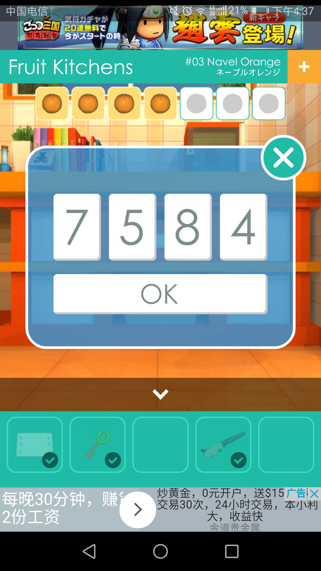 点击左侧柜子上的盒子,用钥匙打开盒子,得到第四个🍊