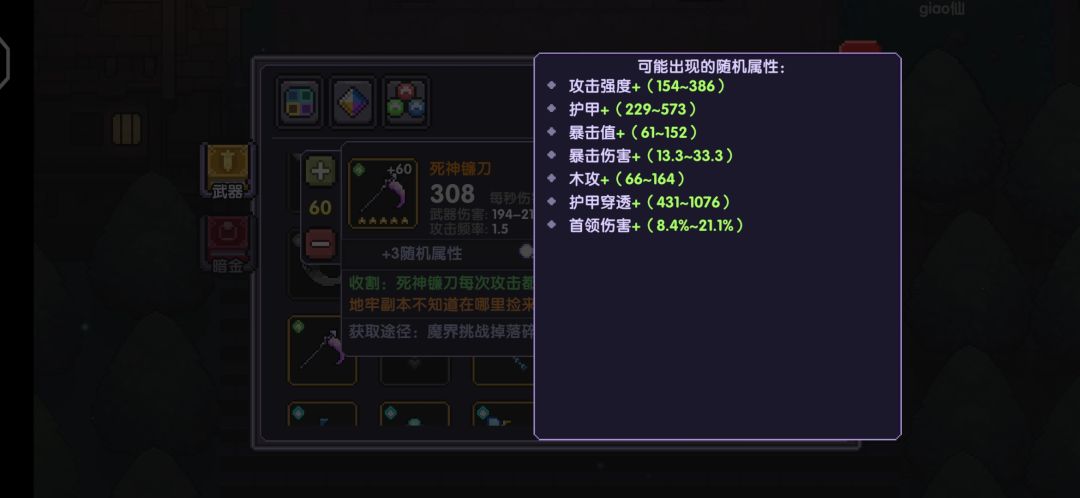 我觉得死神镰刀是前期最好的第二副武器人选,可以洗爆伤也可以洗暴击值,碎片也好得,当然,有了比他更好属性的就换了(例:洗好穿透首伤的龙刀)