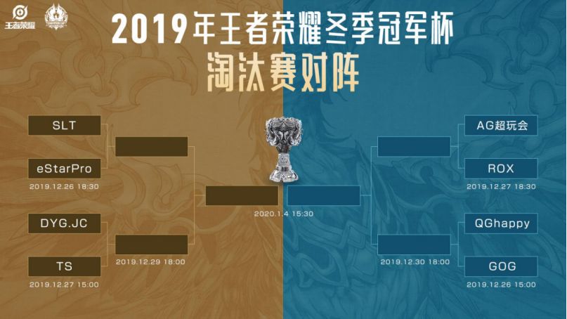2019年12月23日,王者荣耀冬季冠军杯选拔赛完美落幕,KPL赛区战队TS、eStarPro获得晋级资格,将参与王者荣耀冬季冠军杯淘汰赛。至此,冬季冠军杯淘汰赛八强战队已经确定,分别是AG超玩会、QGhappy、DYG.JC、eStarPro、TS、SLT、GOG、ROX,他们将展开激烈对抗,竞逐冰凤凰杯!