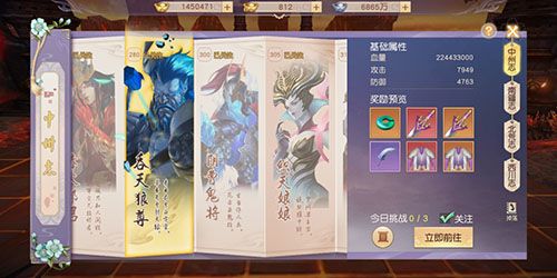 山海图志中包括中州志、南疆志、北荒志、西川志,中州志是以妖王,从低级到高级的妖王都有,在选择妖王的时候,妖王的等级太高打不过,太低则没有奖励,一定要根据自己的等级和实力而行,中州志不需要任何道具即可挑战,每天可挑战3次。