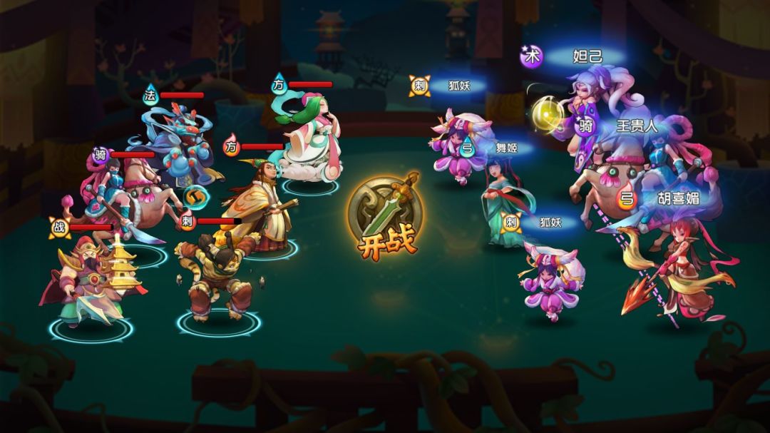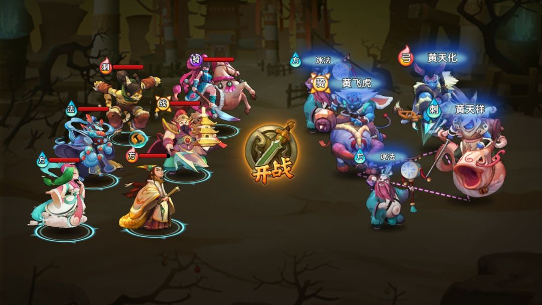 朝歌-黄家:天祥的伤害1200+,飞虎的伤害700+。考虑到天祥的技能特性和属性相克,站位如图所示。由于天祥开大后每次都攻击两次,以及二技能攻击血量最低的目标,极容易秒人。想三星过,需要时刻保留3气用于彩云救场,并尽快集火杀掉天祥。
