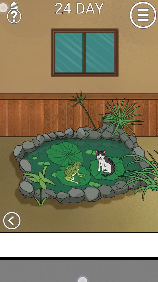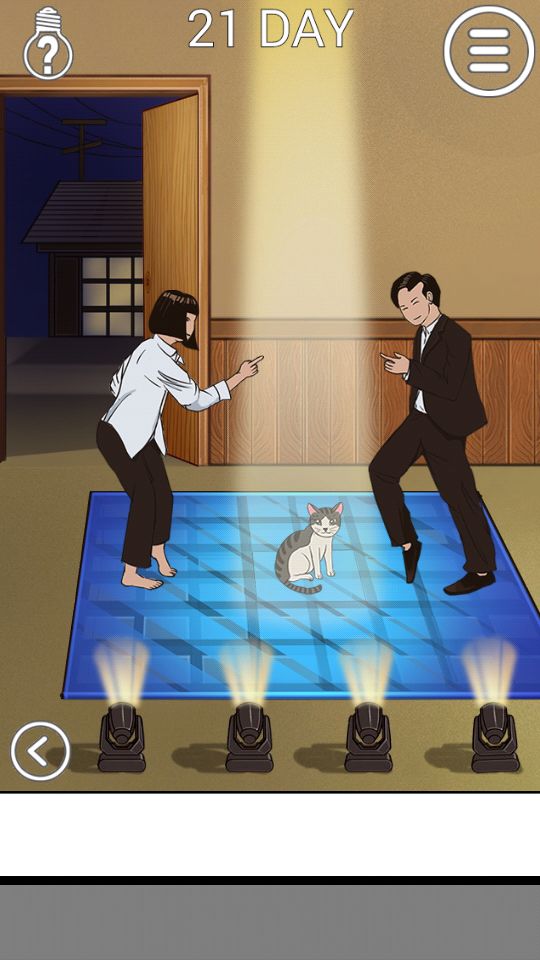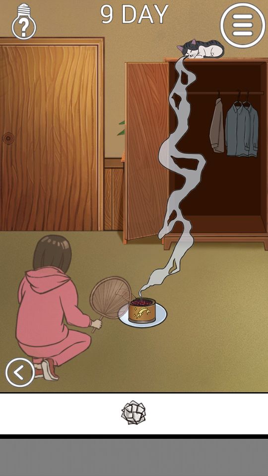 第九关:点左边房间的相框,输入密码6980,拿到鱼罐头,翻左边的书桌,里面有一把扇子,把鱼罐头倒在猫碗里,用扇子扇.