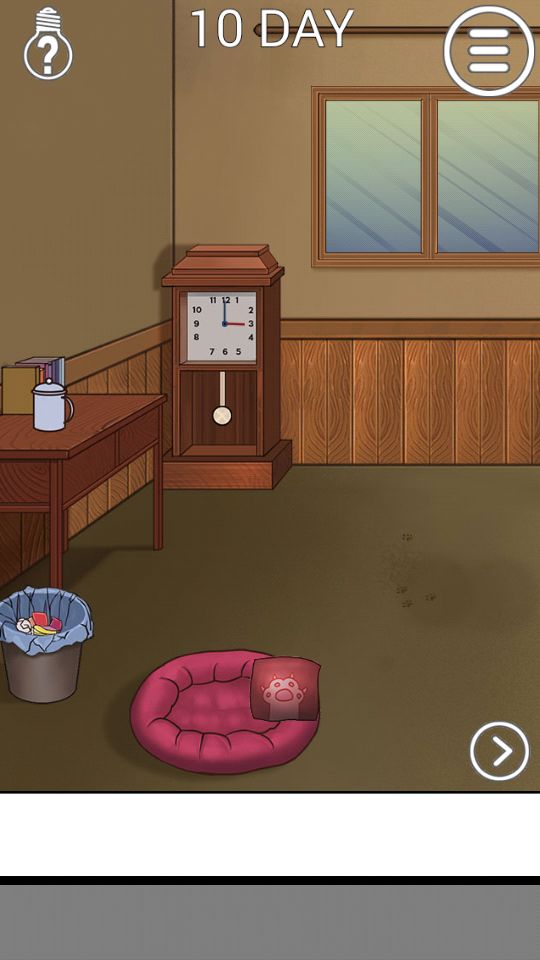 第十关:猫窝里用钟摆,安装上钟以后,点一下,看外面是晚上的时候再点一下,去右边房间开门。