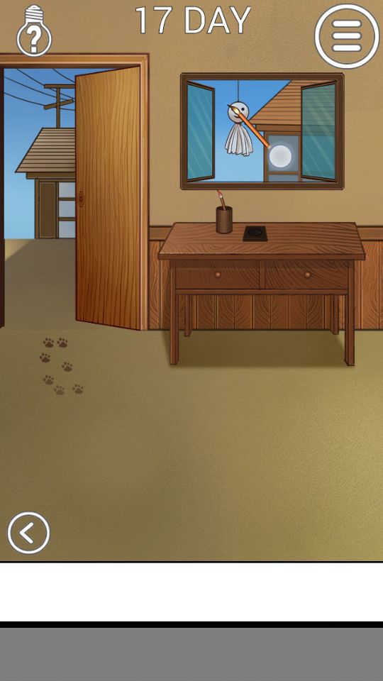 第十七关:笔筒里的笔,沙发靠垫后的白布,钟上的钟摆,三味线上的线;推开窗挂上晴天娃娃,用笔涂成阴雨娃娃。
