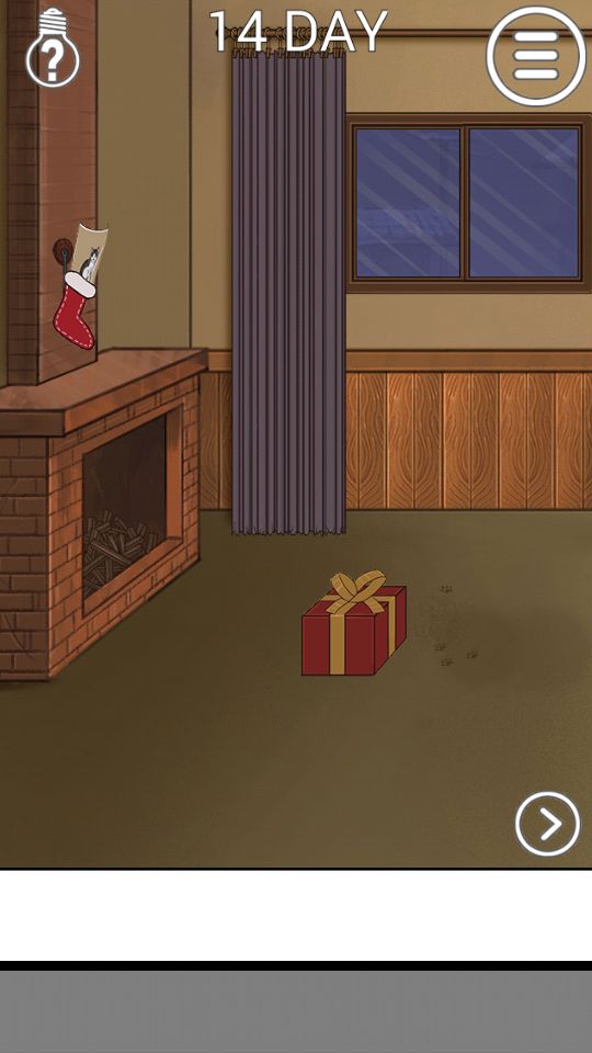 第十四关:拿起鱼缸,去左边房间把火扑灭。回来拿圣诞袜和抽屉里猫咪的照片,挂在壁炉上。切一下房间,拆开礼物盒获得一只猫。