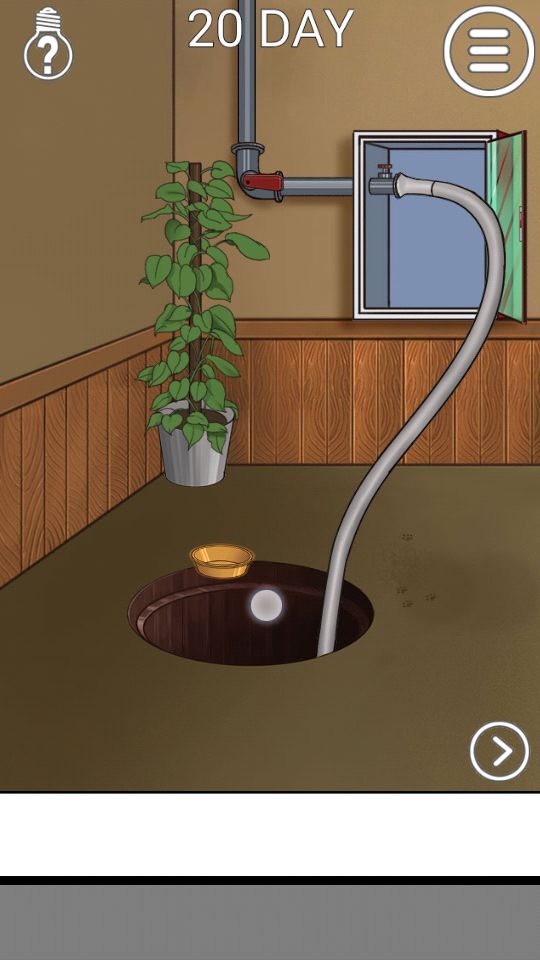 第二十关:开门拿到盆,左边房间移开盆栽看到水闸,点一下开启,打开消防栓拿到水管,接上后迅速把盆子扔到洞口处。