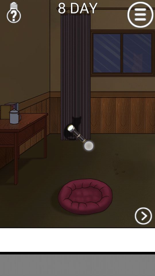 第八关:右边柜子里有手电筒,拿到后关灯去左边房间照亮窗帘的左下角.