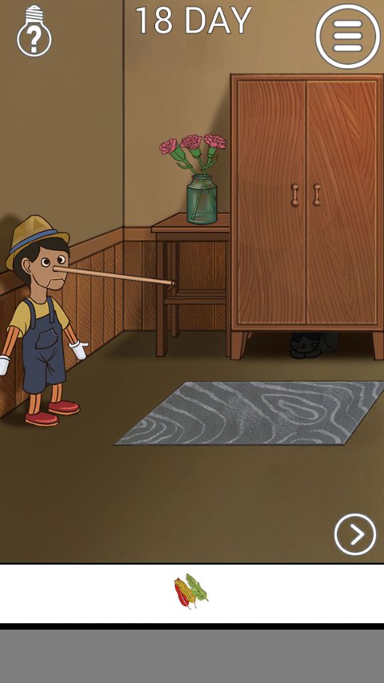 第十八关:推开窗把鹦鹉的翎毛取下来,点五下木偶拿到木棍,可以用组合成的逗猫棒吸引柜子下的猫。