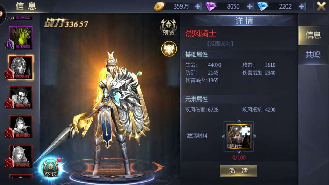 烈风骑士:“范围突刺”,疾风属性,技能分别是刺击、盾波、战吼、横扫。