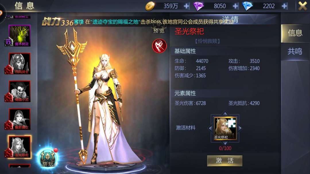 圣光祭祀:“怜悯救赎”,圣光属性,技能分别是光珠、神佑、爆符、惩戒。