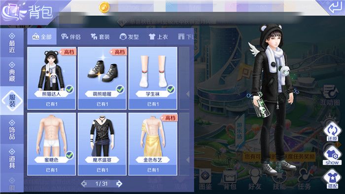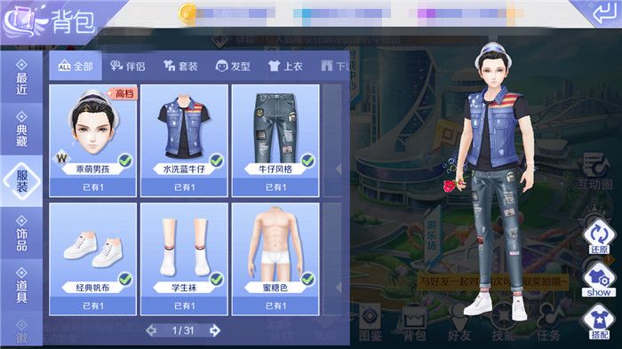 这些奖励轻松到手啦!这套熊猫套装搭配上望远镜手持简直是太可爱啦,“乖萌男孩”发型也比较酷,带上帽子有一种西部牛仔的感觉。对于这个发型的搭配,我选择了背包里的“水洗蓝牛仔”上装、“牛仔风格”的长牛仔裤以及一双白色的经典帆布鞋。这样一套比较休闲的装扮也是非常时髦的,作为男生来讲,真的是不会打扮自己也可以在游戏中学会啦!不知道“我”手里拿着玫瑰花,能不能“骗”到一个萌妹子跟我组个CP呢?