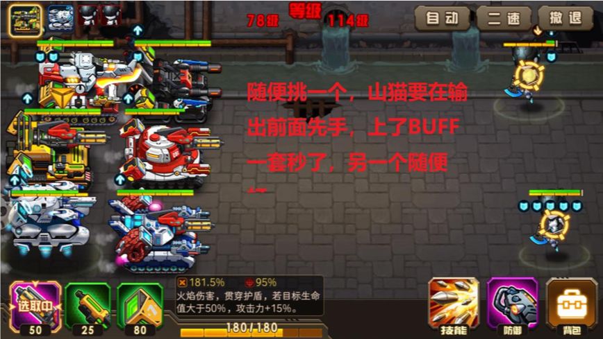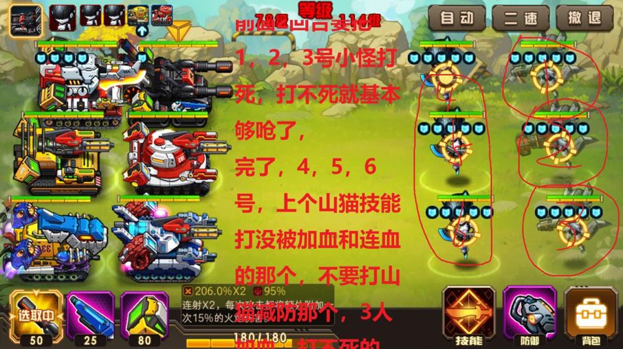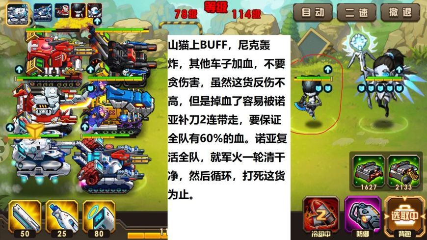 山猫上 BUFF,尼克轰炸,其他车子加血,不要贪伤害,虽然反伤不高,但是掉血了容易被诺亚补刀2 连,容易崩,这个死之前不要打诺亚,不要打诺亚。