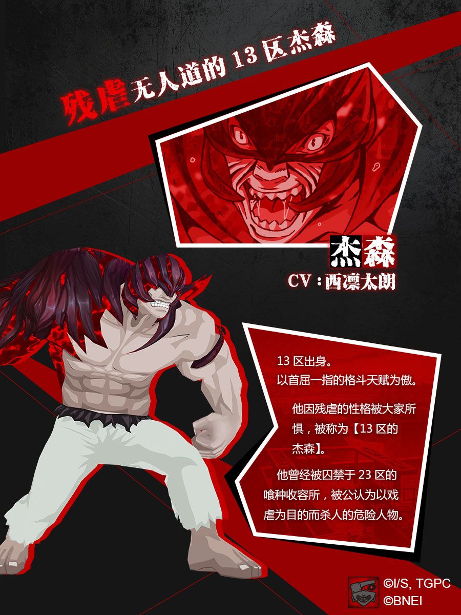 今天要给大家介绍的是13区的残虐喰种-杰森,以残害别人为乐趣的暴虐杰森,同样也有着屈指一数的格斗天赋,在《东京战纪》也是不可或缺的战斗角色!各位请驯服杰森,让他在你变成强者的道路上成为你的战斗力吧!