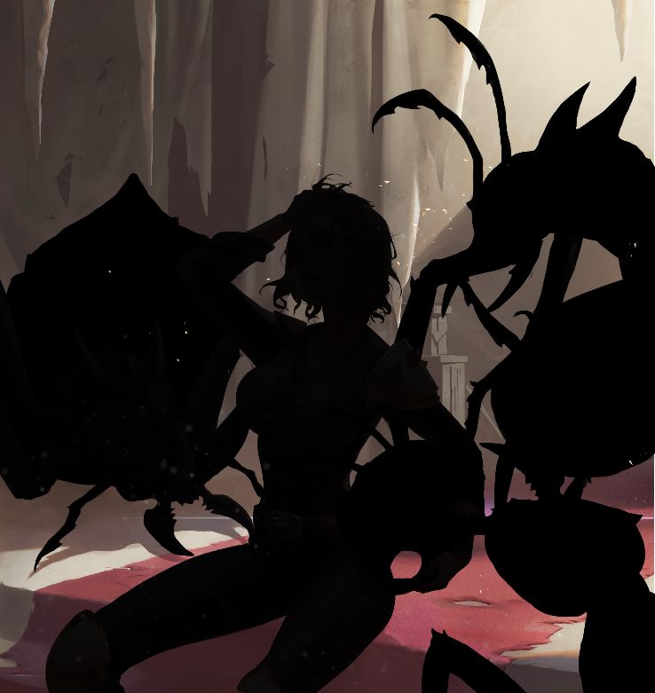 随意地坐于长阶之顶,婀娜的身段展现出末世里弥足珍贵的美感,似乎在享受着难得的休憩与放松。然而那群围绕在身边的黑影却又让人不寒而栗——被怪物簇拥的这个人,到底是敌是友?
