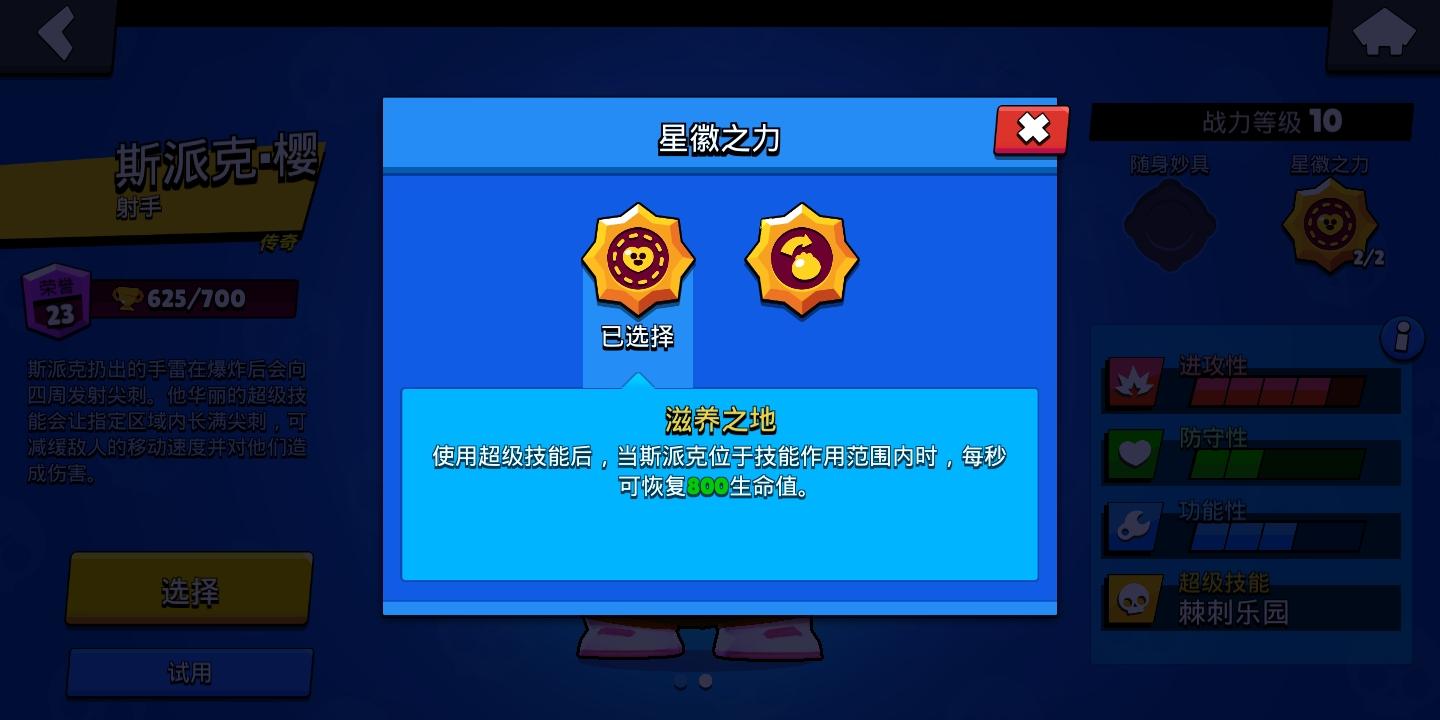【星辉之力 】①~[滋养之地 ]:使用超级技后 ,斯派克位于技能范围内的话 ,可以为自己每秒恢复800生命值 ,这个星辉在自己残血的时候还可以为自己回血,有的情况下还能反杀敌人 ,这是必备之选 。