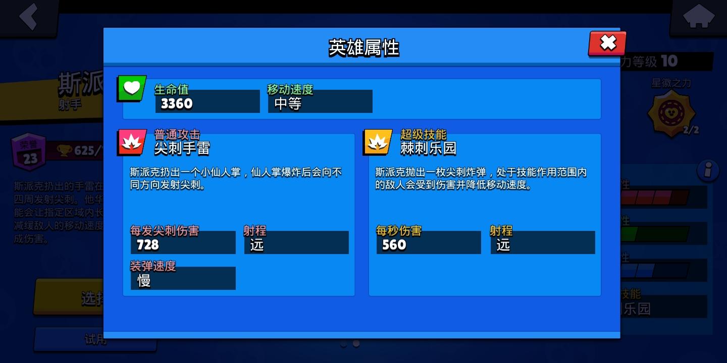 【妙具】~[尖刺针垫]:斯呱克向周围发射三波尖刺,每波有10根尖刺,每根尖刺造成[520]伤害,妙具每5秒可使用一次,个人觉得不错,但为啥没特效?1.【吃鸡地图】~这个英雄几乎适应全图,(除了那两草多的)打箱子可以贴身打,这样伤害高,能打得更快,加快发育节奏。当敌人卡你位置时,可用身边的墙为掩体,出去丢一发然后又躲回来,就这样一直消耗敌人血量,小萌新见意带上星辉①,打吃鸡地图还是保命要紧,如果对面还不是暴发类英雄的话还可以反打对面,是不是很有意思呢?吃鸡地图探草进草很重要,草能提供掩护,想拿更多杯数,占据有们地行是不可少的,而斯派克是天生探草能力强的英雄,在草中的敌人很难逃过攻击,这样可以逼他们出草丛,自己占有为王,这样可以更好上分,当你在此模式用星辉②的时候,可以更好的打中敌人,更快使大招刷出来,有大招后可以用大招辅助攻击,能更容易打中敌人!