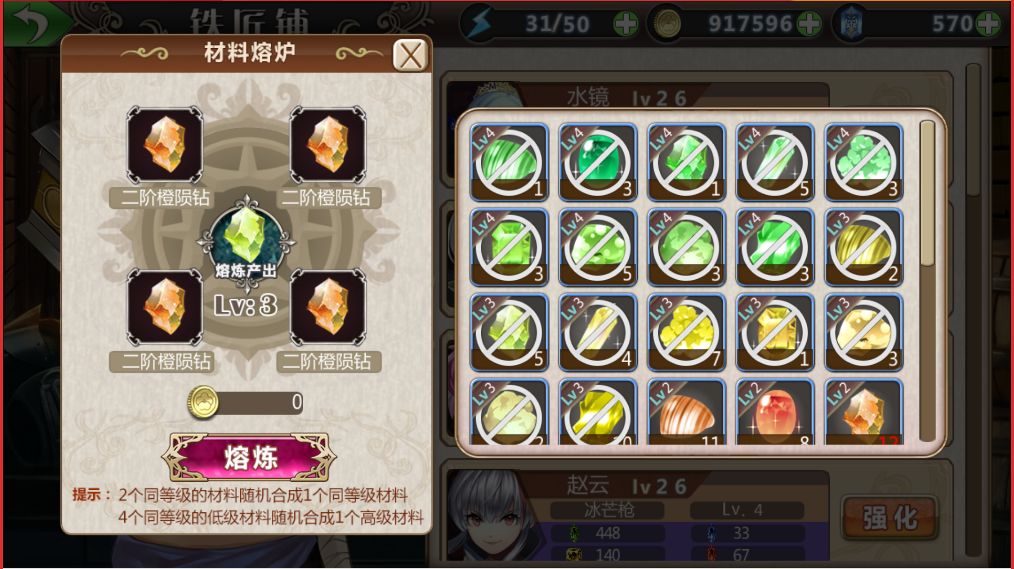 熔炼需要使用同等级材料,使用2个同等级材料随机获得一个同等级材料,使用4个同等级材料随机获得一个高等级材料。