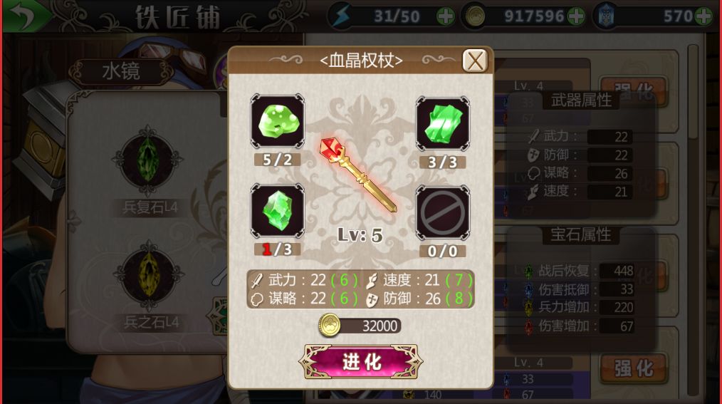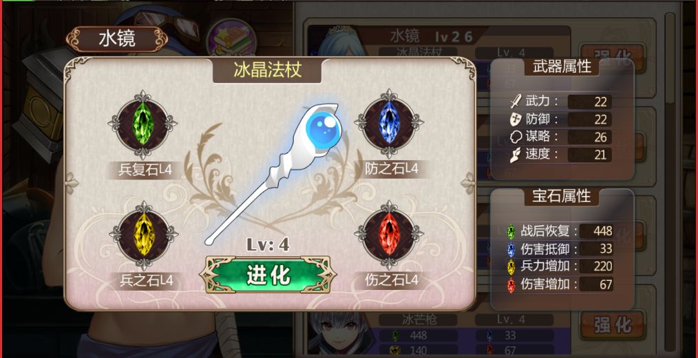 进入铁匠铺后显示当前武将列表,列表中显示当前战姬们的武器及宝石镶嵌情况,四种宝石镶嵌满之后可以提升武器等级。