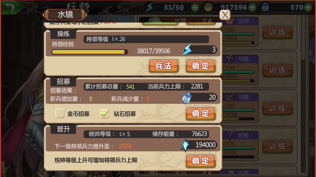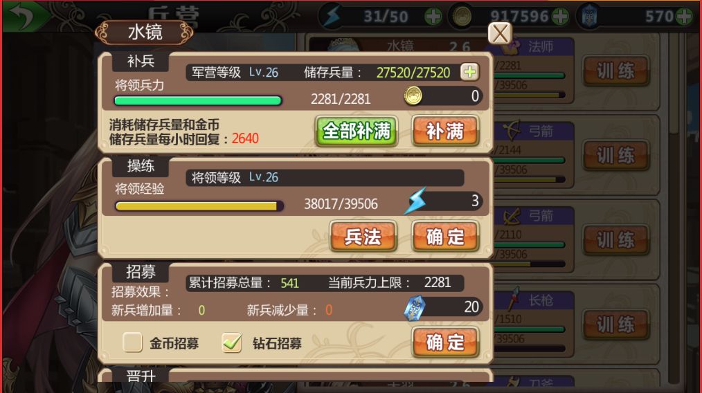 招募:消耗金币或者钻石来提升武将兵力上限,提升的兵力上限与武将等级有关;