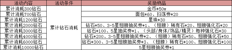 活动内容:活动期间,累计消耗指定钻石数,即可获得超多刚需物品,快来参与吧!