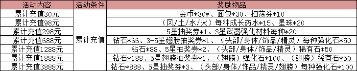 活动内容:活动期间,累计充值满指定金额,即可在活动结束后获得稀缺资源或道具, 5星极品翅膀在等着你!