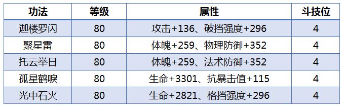 迦楼罗闪是80级功法4号位中唯一的攻击功法,增加的攻击和破挡强度两个属性可以提高较多的攻击力。聚星雷和托云举日可以大幅度增加物理防御和法术防御,在团战中存活的时间越长打出的输出才能越多,石族和萧族可以选择这两个功法,增加自身防御力。