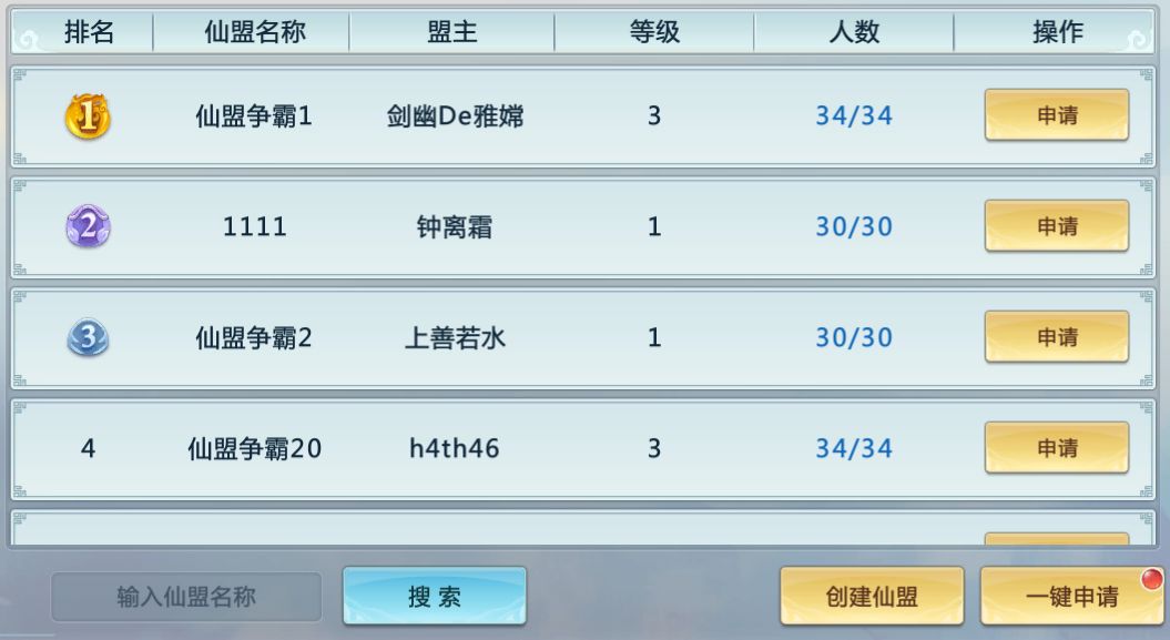 上仙们可以选择创建自己的仙盟,创建仙盟需要花费500w铜币,上仙们也可以选择加入已经创建好的仙盟。