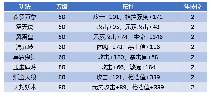 2号位同样给大家推荐8种功法。除了3种80级的功法外,建议各位斗者保留森罗万象、霜天诀和星罗鬼舞这三种。这三种功法都增加了较多的攻击值,霜天诀更是既增加了攻击属性又增加了元素攻击属性,但霜天诀属于稀有功法,除了家族拍卖中有几率出现外只能通过限时活动或者商城宝箱获得,若是无法获得也可以选择风雷皇功法。