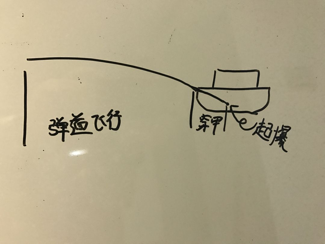 在《工艺战舰:重聚》中,火炮使用的是APHE即穿甲榴弹。炮弹同时具有了穿甲能力及爆破能力。因此火炮类武器的攻击存在有三个阶段,即:弹道飞行阶段、穿甲阶段、起爆阶段。(下面开始灵魂画图了~)