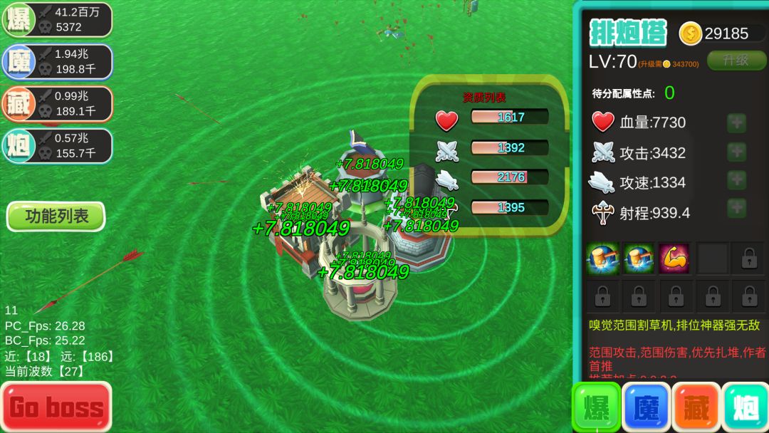 炮塔,升攻击和攻速,自己按情况升,最好攻击和攻速保持一至
