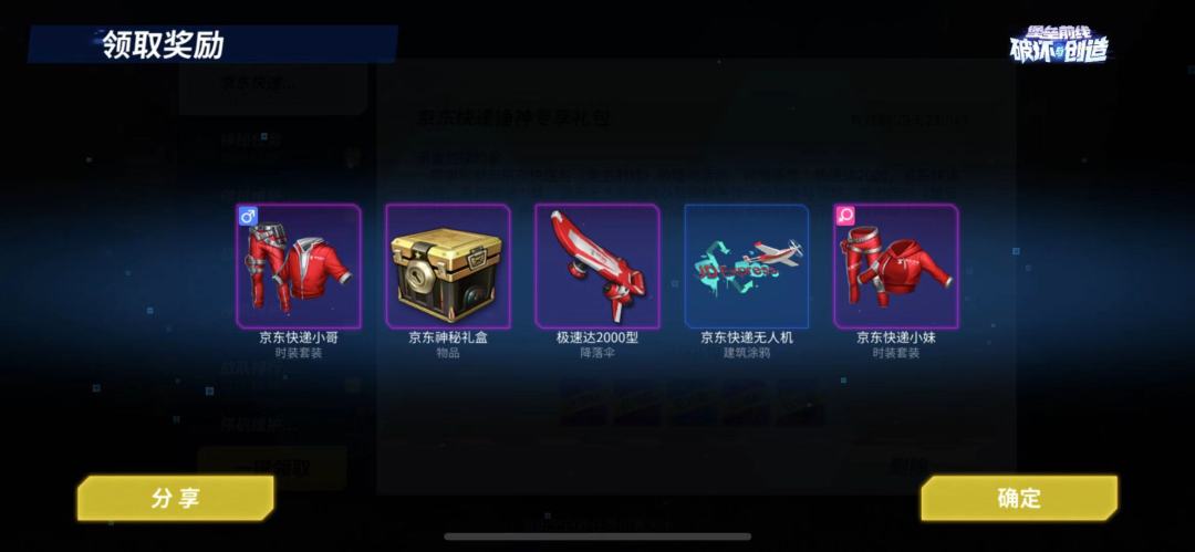2019年12月26日-2020年1月9日联动活动期间,探险家可以通过以下方式进入礼包领取页面,领取页面进入方法包括:京东商城app内推送;在京东小哥微信公众号“堡垒前线”菜单栏,输入关键字“堡垒前线”;扫描堡垒前线大锤定制版京东快递箱;扫描新年定制版自提柜上二维码。完成账号验证操作即可获得“京东快递锤神专享礼包”,礼包将通过游戏内系统邮件发放。